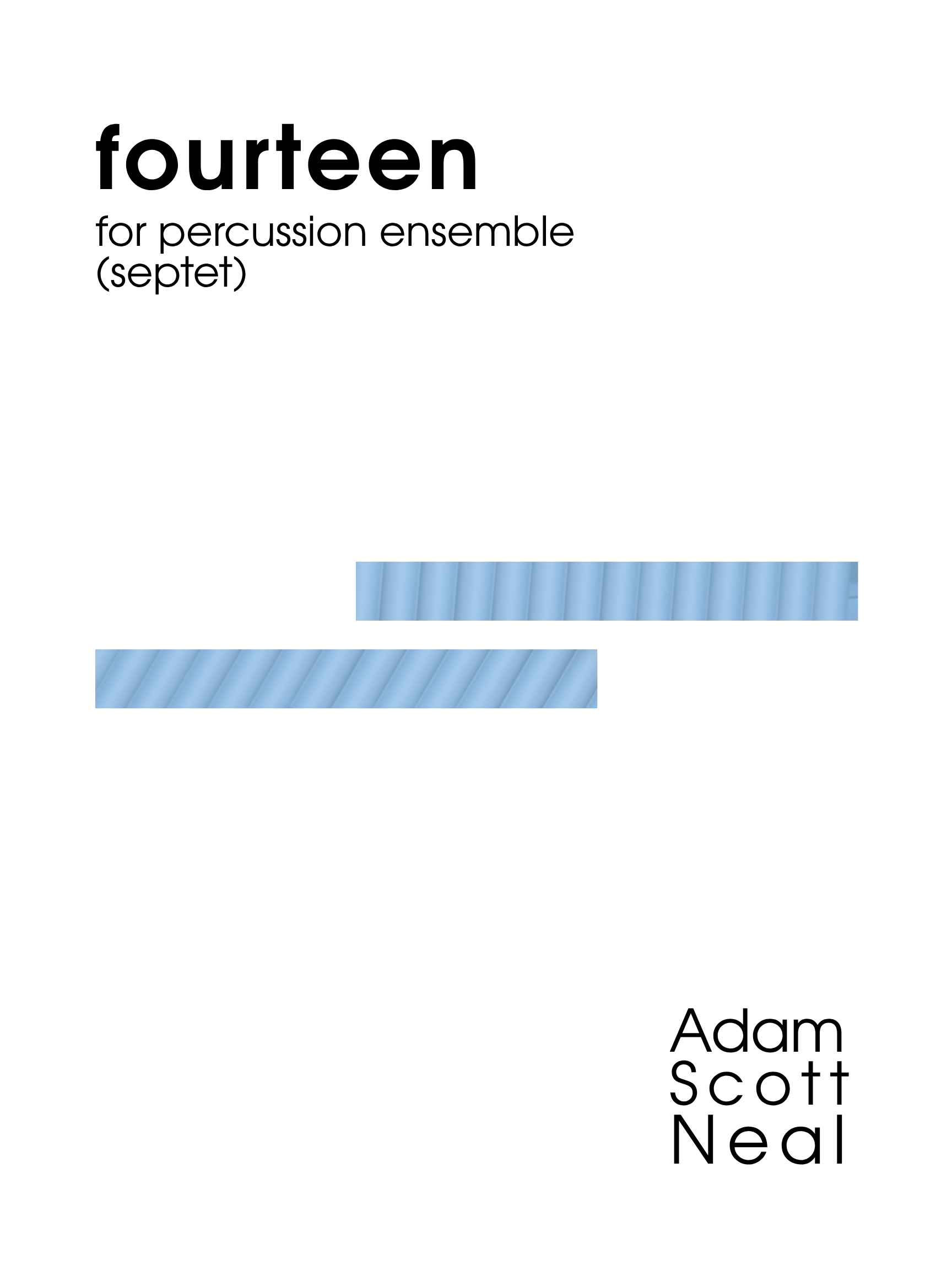fourteen, for percussion ensemble (septet), is a mellow piece for a rainy day. It is written for early high school level percussion ensemble (7 players). While rhythmically simple, the players are encouraged to focus on the small details and changes in their parts, as well as the ways in which their parts work together.