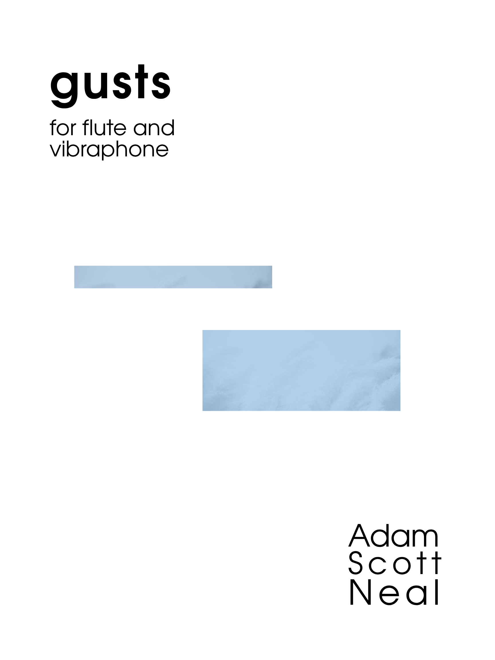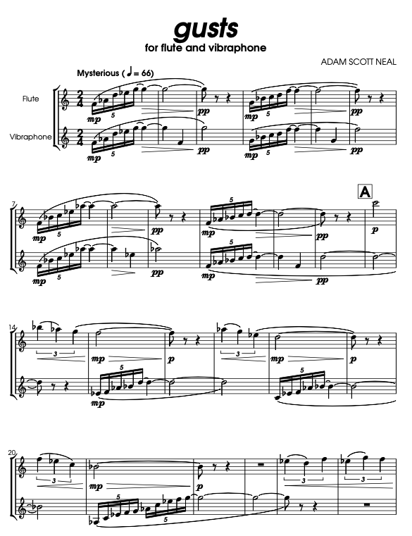 gusts, for flute and vibraphone, features gestures that reminded me of wind. Rising scales ending with held tones resembled to me a small group of leaves blowing across a sidewalk. Slower descending gestures resembled the bending of trees.
